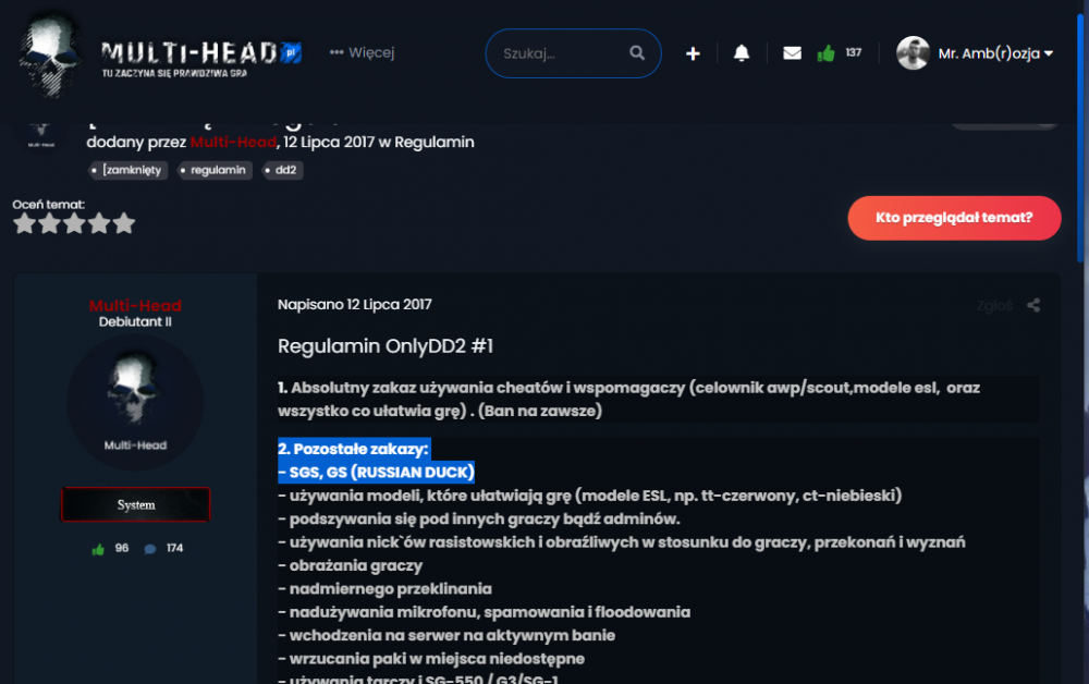 Nick: Mr. Amb(r)ozjaWiek: 30 lat Doświadczenie (w byciu adminem): Spore zwłaszcza ze tutaj juz byłem Adminem ... nie raz xd Znajomość AMXX (W skali 1-10): 8Staż w CS-sie: 13 lat Steam / NonSteam: Steam Dlaczego Ty: Jakiś czas temu składałem już podanie na admina, niestety zostało odrzucone. Z racji, że sporo osób mnie tutaj zna, dobrze wiedzą, że tak łatwo się nie poddaje i składam podanie ponownie. Myślę, że jako admin nie raz pokazałem, że znam się na tej robocie. Sporo osób pod ostatnim podaniem wypowiedziało się pozytywnie, więc świadczy to tylko o tym, iż nadaję się na admina. Tak czy inaczej chętnie zobaczę, jak ludzie wypowiedzą się pod tym podaniem ponownie. Opiekunowie prosze o konkrety dlaczego jestescie na Nie troszkę wyrozumiałości Czas jaki dziennie poświęcasz na CS-a: Róznie na pewno godzinki bedą wyrobione a ja postaram sie być codziennie na serwerze Kontakt: https://steamcommunity.com/id/yorgus121Link do GameTracker'a: https://www.gametracker.com/player/Mr. Amb(r)ozja/145.239.19.217:27015/