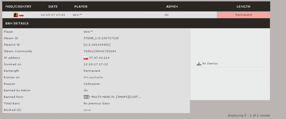 Podejrzewam że zostałem zbanowany ponieważ iż raz lub dwa nie sprawdziłem pozycji i wybiegłem akurat na przeciwnika w celowany, sądze iż S.P Jlo nie powinna mnie banować patrząc tylko na jedną runde na mnie. Jeśli administracja po obejrzeniu demka które też nie zostało mi nagrane stwierdzi że jestem oszustem, to prosze S.P o linka do demka, ponieważ sam z chęcia sprawdzę.