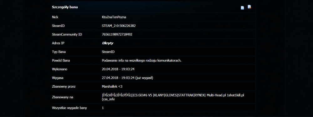 Godzina, data zdarzenia: 29.04.2018 - 10:23:29Mapa: css_dustSTEAM_ID / IP:2:0:1411933902Uzasadnienie: Bana miałem na tydzień minął mi 27 kwietnia a pomimo to dostałem bana za AB. Poniżej dołączam załącznik