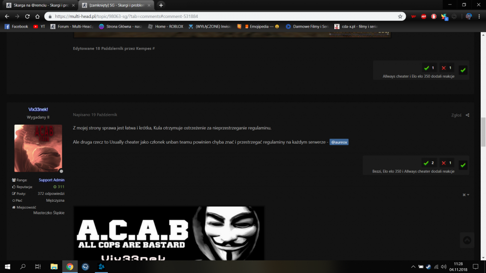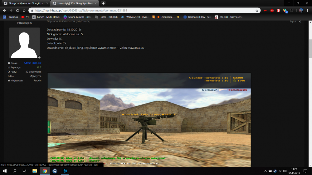 Po 1 nie wymyślam własnego regulaminy BADPLAYER dostał ode mnie upomnienie słowne jak i na say @@ (Ciebie tez się dotyczyło), 2 raz jak postawiłeś przymknąłem oko i dałem ci kolejny raz upomnienie nie posłuchałeś za 3 razem jak już postawiłeś zostałeś nagrodzony banem. A i chciałem dodać że kula (też jest adminem) postawił sg będąc w tt dostał warna. @Bezzi Stosuje się tego ze nie można] stawiać sg stad ze Kula (to tez jest admin serwera) Postawił sg będąc w tt i dostał warna SS na dowód: