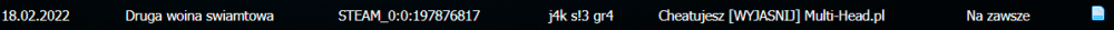 Twój nick podczas gry: Druga woina swiamtowa Godzina, data zdarzenia: 18.02.2022 - 18:45:55 Mapa: dd2 STEAM_ID / IP: STEAM_0:0:197876817 Uzasadnienie: Chcę zagrać na serwerze, nie miałem czasu na gierkę przez jakieś 2 tygodnie. Okazuje się że zostałem zbanowany. Zero rozpiski, banicja klar demka ;3 Dwa tygodnie sprawdzać i zrobić to źle, to już talent @j4k s!3 gr4 Co to jest za powód XD?