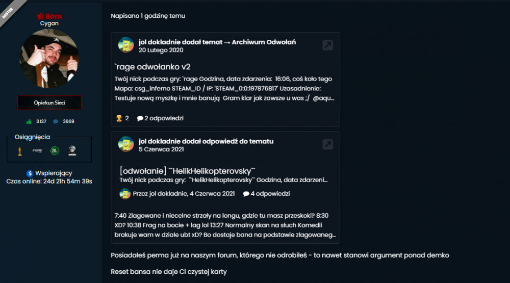 Data zdarzenia: 12:34 25/02/2022 Nick gracza: @Born Dowody: Świadkowie: Uzasadnienie: Podwójne standardy, krycie du*y ubt. Nie pierwszy raz widzę sytuację, że ktoś dostał ub po resecie. A odpracowanie kar wygląda tak o; Link nie istnieje Może zamiast rozpatrywaniem odwołań zajmij się zerowaniem wódy, nie wątpię że to akurat Ci wychodzi. Żadnego bana na forum nie posiadałem. Każde demko w temacie z podlinkowanych odwołań jest klar. A w momencie konfrontacji z rzeczywistością... Zamiast sprawdzić faktyczny stan wiedzy ubt, wyciągasz z du*y wzięte argumenty. Można to skrócić do stwierdzenia, że jesteście konsekwentni w niekonsekwencji i niekompetencji. Także jeśli mam wyjaśnić powód bana ze zgłoszenia - nie cheatuje i ch*j, chociaż imo @j4k s!3 gr4 nawet nie przejrzał tego demka. Nie wiem kto tu czyj czas marnuje, skoro dostaje zaproszenie na forum żebym się odwołał ;v