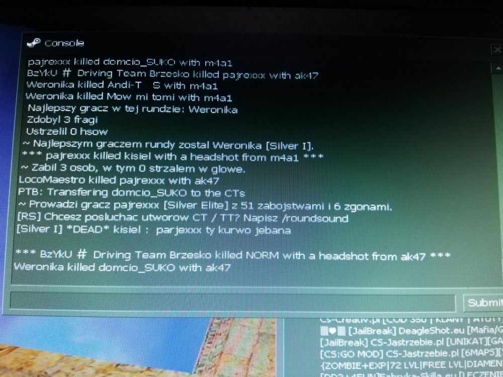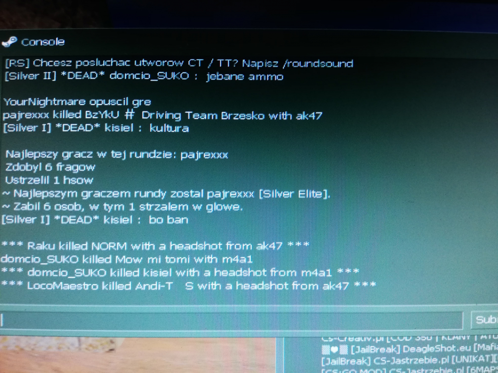 1. Data zdarzenia: 08-05-2020 godzina około 23 Nick gracza: kisiel STEAM_1:0:1888105136 Dowody: kisielek.dem Świadkowie: nie trzeba Uzasadnienie:Myślę, że nic nie trzeba uzasadniać:) Kisiel na początku pisał, że da mi bana mimo iż nie był adminem a potem zwyzywał. Odpaliłem demko i porobiłem parę zdjęć konsoli ale jeżeli ktoś chce przejrzeć demko to też jest w dowodach:) Akcja z wyzywaniem zaczęła się w 13 rundzie a to "podszywanie się pod admina" trochę wcześniej. Na koniec taki mały pokaz hipokryzji z jego strony:)