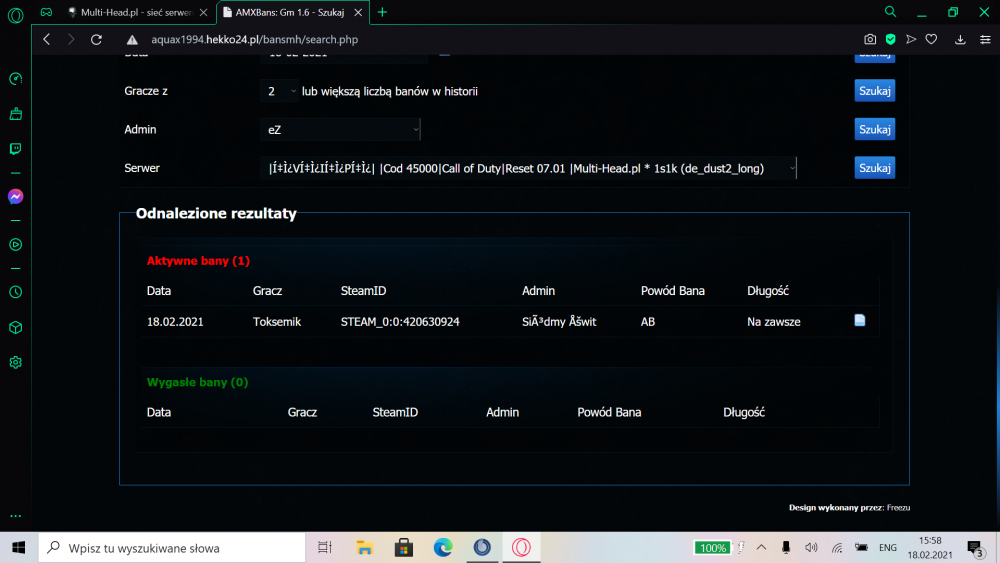 Twój nick podczas gry: Toksemik Godzina, data zdarzenia: 15:52 Mapa: de_dust2_long STEAM_ID / IP: STEAM_0:0:420630924 Uzasadnienie: Dostalem bana na cod 400 za niby aktywnego bana. Nie przypominam sobie sytuacji bym dostawal tutaj perma lub bana ktory mogl nie minac po za tym byl reset bans i mam czystego bansa oprocz tego AB wiec nie wiem dlaczego zostal nadany taki ban mam nadzieje ze szybko zostanie to wyjasnione. [AMXBans] =============================================== [AMXBans] You have been banned from this Server! [AMXBans] You can complain about your ban @ www.Multi-Head.pl [AMXBans] Reason: 'AB' [AMXBans] Duration: 'permanently' [AMXBans] Your SteamID: 'STEAM_0:0:420630924' [AMXBans] Your IP: '188.33.60.121' [AMXBans] =============================================== Owszem dostalem destroya ale z banem na 7d za kultura a nie permem hhahahhaa. Wiec troche smieszne jest ze banujesz kogos nie bedac pewnym .