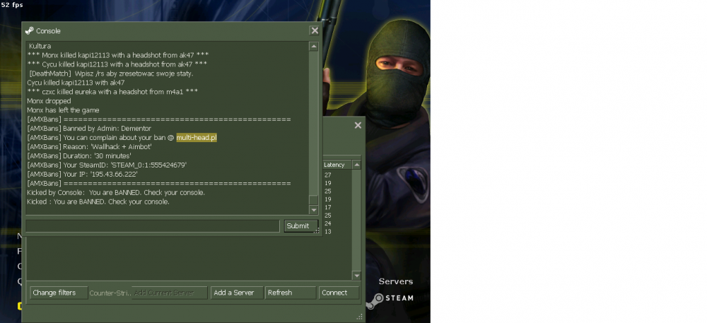 Twój nick podczas gry:czxc Godzina, data zdarzenia: 18:33 13.3.2021 Mapa:de_dust2 STEAM_ID / IP:'STEAM_0:1:555424679' / IP: '195.43.66.222' Uzasadnienie: Żądam rozpisania dema przez administratora bo skoro zbanował mnie za Wh + AIMBOT w jego mniemaniu to musi miec na to dowód. Zostałąm zbanowana za doba gre, bez wykonania screenow nagrania dema. Proszę jakaś kompeteną osobe z adminsitracji o usuniecie tego czlowieka z administracja gdyż jest poprostu nie kompetetny czekam na rozpisanie dema nie obchodzi mnie skad je Pan DEMENTOR weźmie skoro zbanowal za aima + wh musi miec dowody. Swoją drogą propouje lepiej dobierac administracje bo jesli ktos poprostu góruje na serwerze nad innymi graczami i zostaje za to zbanowany no to troche slabo. Ponizej wrzucam screen bana nie ma an idema ani ss . Teraz kolega się tlumacz Jednocześnie apeluje o usuniecie tej osoby z administracji.