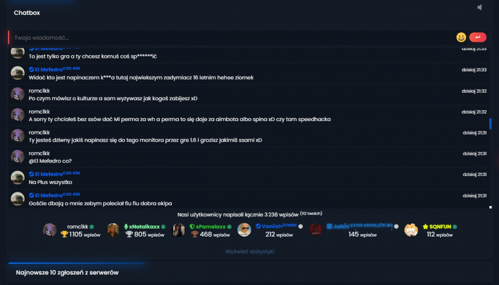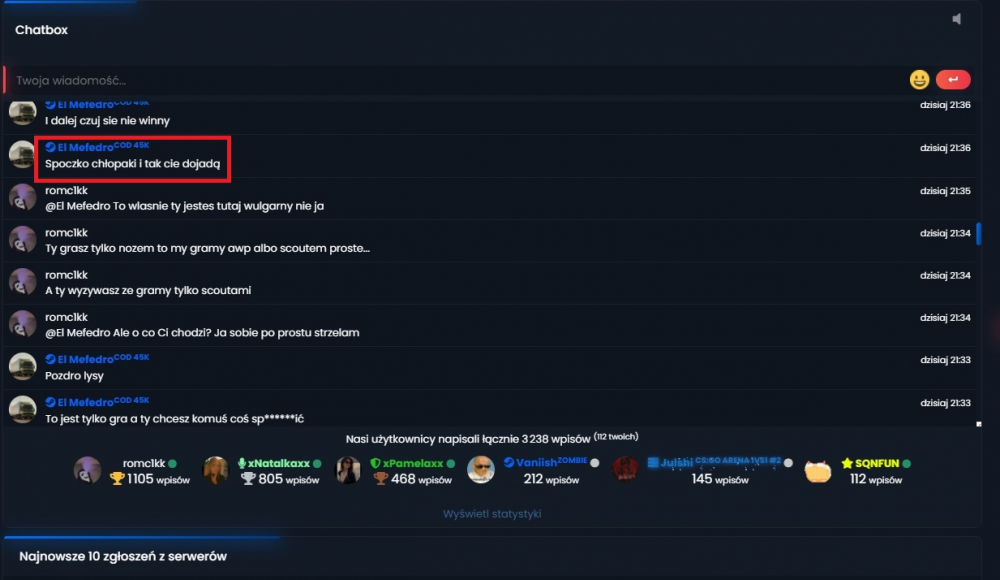 Data zdarzenia: 28.07.2021 Nick gracza: El Mefedron Uzasadnienie: Uważam, że admin serwera powinien świecić przykładem zamiast wszczynać niepotrzebne kłótnie - jest to kompletnie niepotrzebne, psuje tylko atmosferę na forum oraz stawia sieć w złym świetle. Ponadto znalazły się również tutaj groźby które są karalne w świetle polskiego prawa. Jeżeli admin został już ukarany przez moderatorów forum to przepraszam za temat ale nie jestem w stanie tego zobaczyć. Dowody: