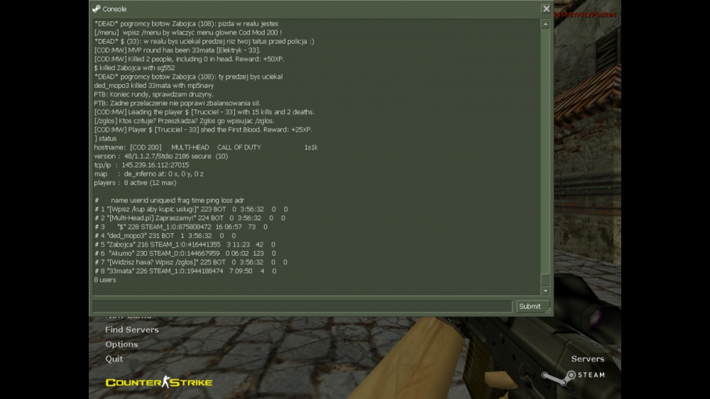 Nick cheat'era: kicic Godzina, data zdarzenia: 5.11.2021 teraz Mapa: office Serwer: cod 400 Link do demka: https://www71.zippyshare.com/v/gHgVS5Zs/file.html STEAM_ID/IP: "kicic" 310 VALVE_0:4:1068313723 Uzasadnienie: na demku widać perfidnego aima