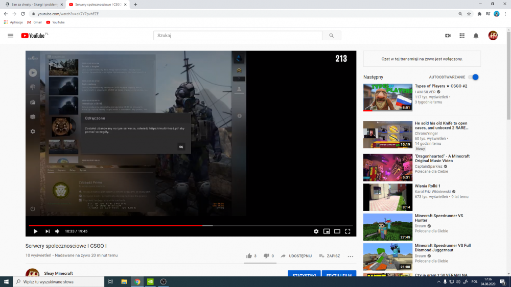 Data zdarzenia: Nick gracza: 04.08.2020 Dowody: https://www.youtube.com/watch?v=eK7Y7pvhEZE ban jakies 10 minut chodzi o czas Dokladnie 10.30 (Edit) Świadkowie: Live Uzasadnienie: Dostalem bana za cheaty gdy pykalem sobie na live w csgo na serwerze