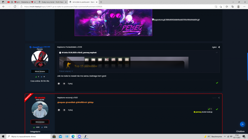 Nick: Gazik Wiek: 17 Link do BanID: https://banid.pl/kto?to=0:1:147566617 CS 1.6/CS:GO*: CS:GO Ile czasu dziennie spędzasz na forum: Jak jestem w domu to cały czas odpalona przeglądarka z forum Coś o sobie: Jestem Kacper chodzę do 3 klasy technikum na kierunku elektryk, lubie se pograć w cska i inne gierki Doświadczenie: Byłem adminem jak i opiekunem serwera Only Mirage, Dlaczego Ty: Spędzam dużo czasu na forum i widzę, w okienku gdzie są reporty graczy z róznych serwerów csgo jak i cs.1.6, że dużo osób oszukuje w tej grze. Jeśli chodzi o stronę CSGO to tak naprawdę to tylko na Mirage i teraz powoli na AWP są jacyś administratorzy a tak to na Arenach 1vs1 oraz COD Mod nie ma żadnego admina. Jeśli chodzi o kwestię banowania i sprawdzania to nie będę miał z tym problemu, bo raz, że spędziłem prawie półtora roku z flagami adminowskimi, a druga sprawa to jest taka, że mam ponad 4000 godzin w Cs'ie i umiem odróżnić osobę z cheatami od normalnych graczy *Można wybrać to i to*