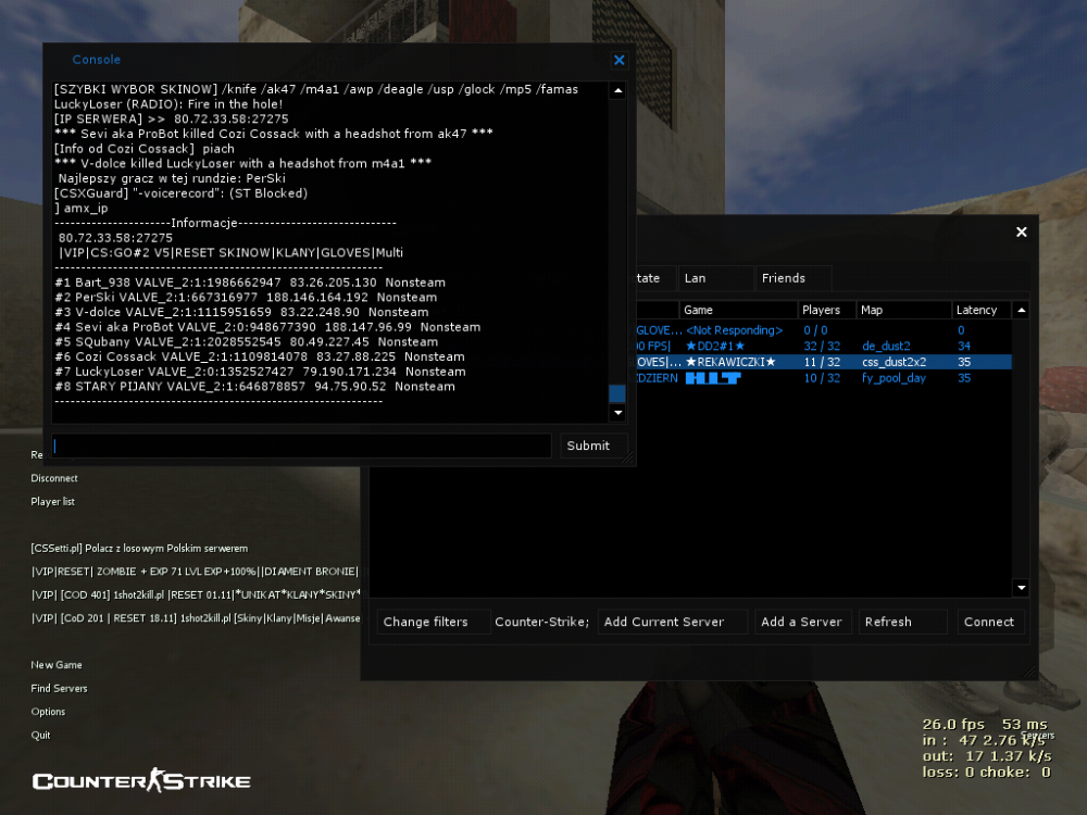 Nick cheat'era: 1. KGM-n 2. jakub Godzina, data zdarzenia: 15:11-15:31 23.11.2018 Mapa: css_nuke2x2 Serwer: cs:go #2 Link do demka: http://d1.hltv.org.pl/srv30939/HLTV-1811231511-css_nuke2x2.dem.zip STEAM_ID/IP: 1. VALVE_2:0:1113396399 85.202.41.225 Nonsteam 2. VALVE_2:1:503512236 83.31.63.71 Nonsteam Uzasadnienie: ...