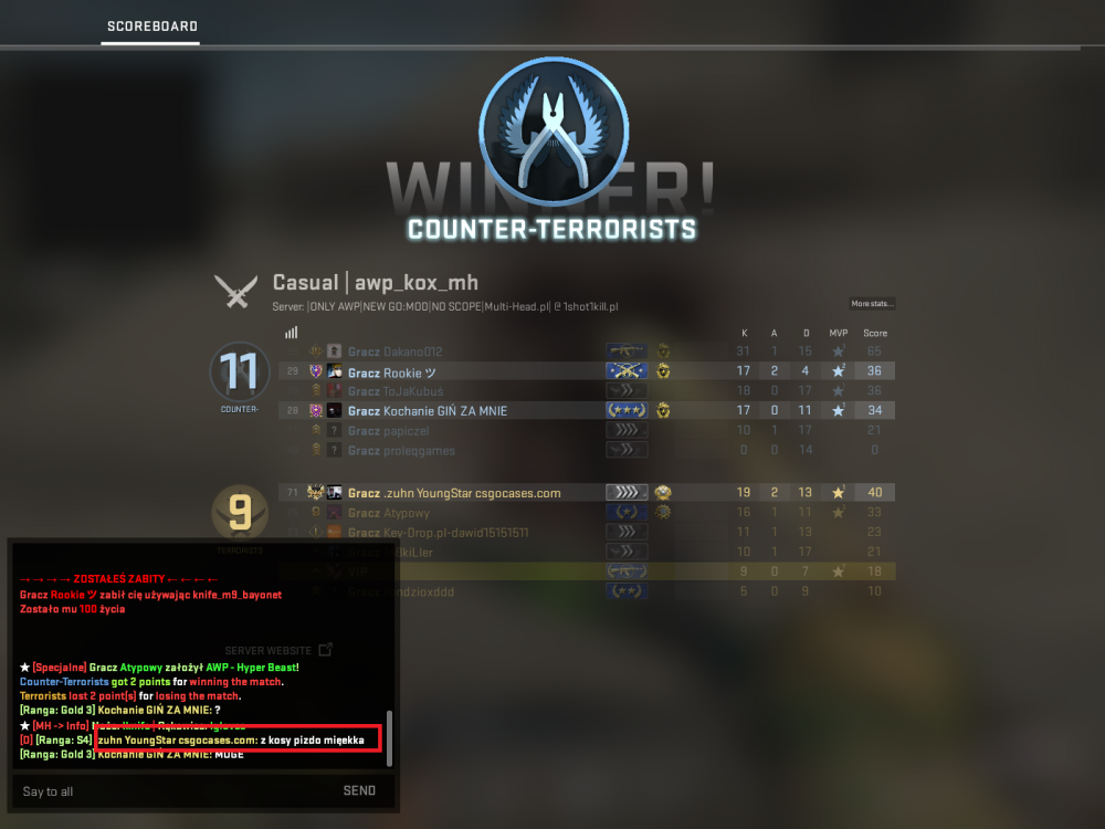 Data i czas zdarzenia : Dziś, 16:59 Nick gracza : .zuhn Youngstar csgocases.com Dowód : Screenshot Uzasadnienie : kolega obraża każdego, kto go zabije - krótko mówiac rage po śmierci Świadkowie : kondzioxddd, Kochanie GIŃ ZA MNIE, papiczel