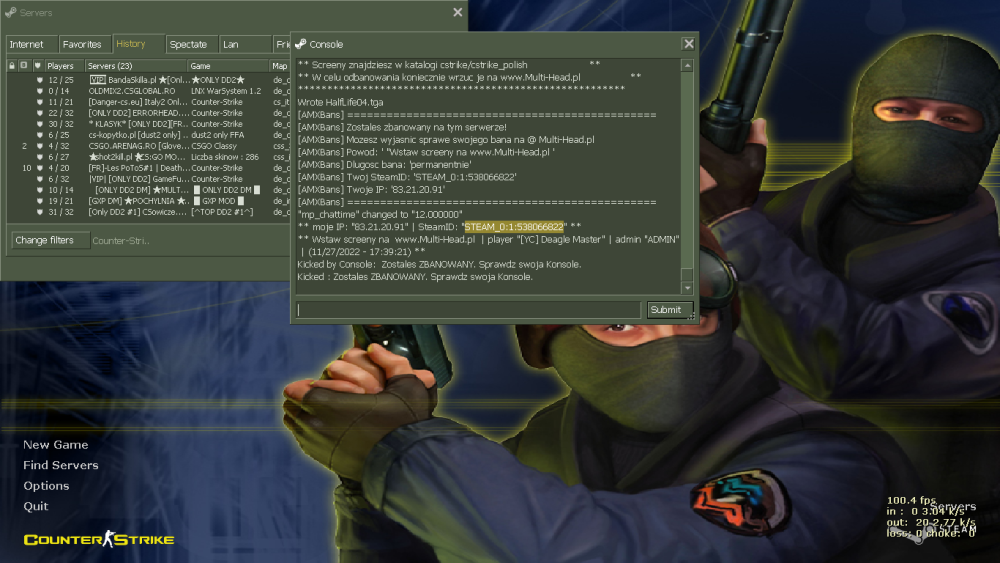 Twój nick podczas gry: AbraaKaDabra Godzina, data zdarzenia: 5-10 min temu.. Mapa:De_Dust2_long STEAM_ID / IP:STEAM_0:0:577114611 Uzasadnienie:Gram,gram.. i nagle z dupy BAN.. Nie posiadam żadnych wspomagaczy.. Proszę o wyjaśnienie sprawy ||| You are banned ||| Nick: AbraaKaDabra ||| IP: ******** ||| SteamID: STEAM_0:0:577114611 ||| By admin: [COD 400] Multi-Head ||| Reason: [COD 400] ANTY CHEAT ||| Ban created: 11.05.2023 - 19:42:03 ||| For length: 2 miesiace, 1 tydzien, 2 dni, 10 godzin i 39 minut
