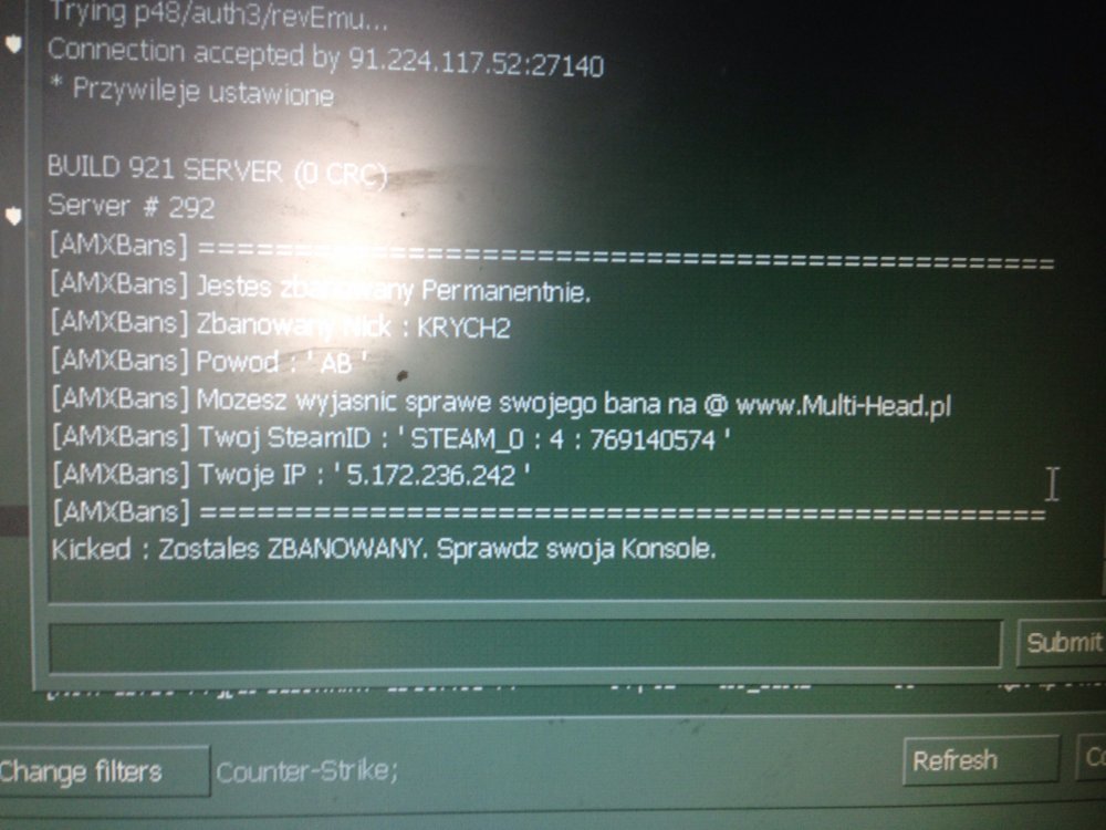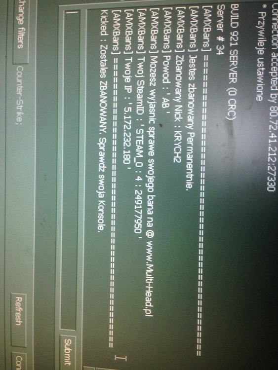 Twój nick podczas grania: MasterCiasteczko Godzina,data zdarzenia: 18.01.2018 Mapa:css_mirage link do screenów: http://www79.zippyshare.com/v/cmCp9xkS/file.html STEAM_ID / IP: 4 : 1380228340 [AMXBans] =============================================== [AMXBans] You are permanently banned. [AMXBans] Banned Nickname : MasterCiasteczko [AMXBans] Reason : ' Wstaw screeny na Multi-Head.pl ' [AMXBans] You can complain about your ban @ www.Multi-Head.pl [AMXBans] Your SteamID : ' STEAM_0 : 4 : 1380228340 ' [AMXBans] Your IP : ' 81.219.213.13 ' [AMXBans] ========================================