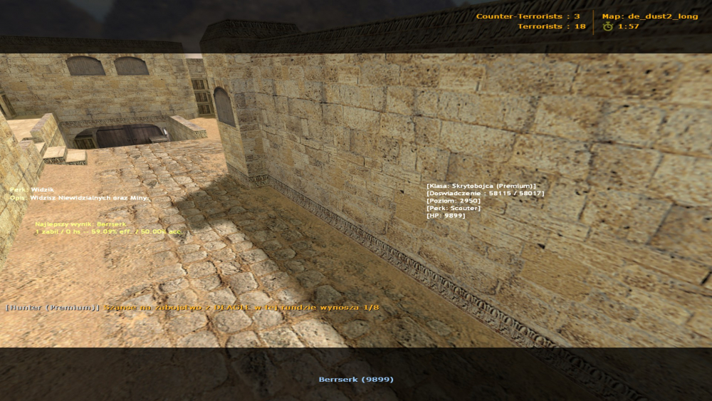 Przed resetem każda klasa która w opisie miała "2 skoki" miała 2 podskoki, teraz ma jeden. Nie wiem czy to błąd czy umyślna zmiana ale wolę to zgłosić. to samo tyczy się perka jumper (zamiast +2 tak jak w opisie, jest +1) i multi jump[vip] (zamiast +4 jest +3) Widzik nie działa na skrytobójce !?!?!?!?!?!?!?!?!? Modul odrzutowy nie skaluje sie z inteligencja W dodatku skrytobójca ma od nowa 100% niewidki, a kiedyś aquax zmniejszał te procenty i przed resetem było wszysko "normalnie" tzn skryto był lekko widoczny, a teraz wydać ledwie cień i nie działa na niego widzik. screeny pokazujące jak widać (nie widać) mimo iż ma się perk widzik. @VisTeR.' W dodatku top 15 resetuje się co dziennie.