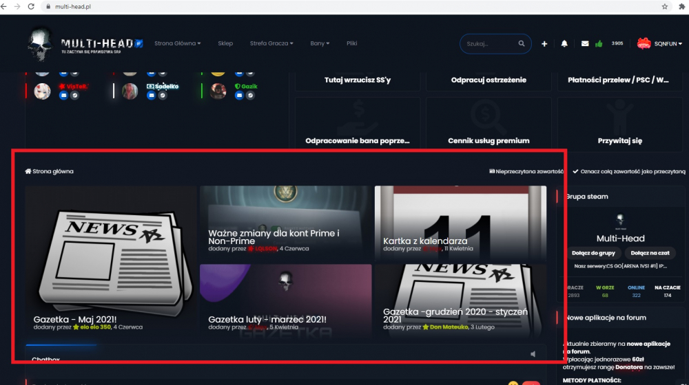 1.Proponuję dodać coś takiego jak na Facebooku, że byłaby możliwość komentowania czyjegoś postu i nie trzeba byłoby wtedy edytować postu i oznaczać @, żeby coś tej osobie odpowiedzieć. 2.Proponuję zmienić silnik forum na MyBB , bo jest dużo bardziej wygodniejsze i ma fajną wersję mobilną (Wiem, że już kiedyś próbowałem to, ale dajcie się wypowiedzieć innym ludziom co byli na forum z takim silnikiem). Lolson ostatnio mi odpowiedziałeś, że do tego silnika macie dodatki takie jakie potrzebujecie, a przecież do każdego silnika forum na pewno są nie tylko tego co jest teraz. Lub ewentualnie jakąś wersję mobilną bez zmiany silnika. 3. Proponuję zrobić takie połączenie komendy /zgłos z forum na wszystkich serwerach, że po zgłoszeniu przez jakiegoś gracza na serwerze, osoby, która czituje lub łamie w jakiś sposób regulamin na forum do adminów przychodziły by powiadomienia w zależności od serwera np. ktoś zgłosi kogoś na serwerze cod mod to powiadomienia przychodzą tylko do adminów cod mod, na dd2 do adminów dd2 itp. A powiadomienia do ubt czy wyższych rangą przychodziły by z wszystkich serwerów. Żeby ograniczyć nadużywanie tych zgłoszeń to byłaby tylko jednorazowa możliwość zgłoszenia osoby na 10-15 min (tyle utrzymywało by się zgłoszenie na forum) i byłoby tak, że jedna osoba może zgłosić daną osobę. W powiadomieniu pokazane byłyby Nick osoby zgłaszającej, nick zgłoszonej osoby, IP/sid obu osób, nazwa mapy, data. Nie każdy ma Steam oraz konto na forum, żeby napisać do admina, więc byłaby to bardzo fajna rzecz. Admin, który byłby online na forum, a akurat nie grałby w tym czasie, jeśli miałby chęć i możliwość mógłby wejść na serwer i zareagować. Proponuję to, ponieważ 4/5 lat temu na pewnej już nie dającej oznak życia sieci było coś podobnego i bardzo dobrze sprawdzało się.
