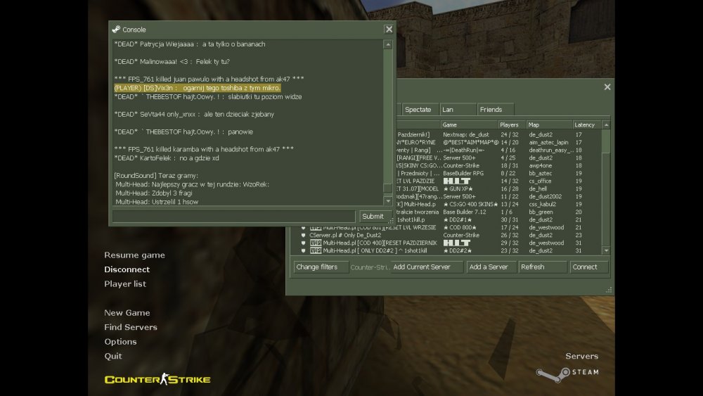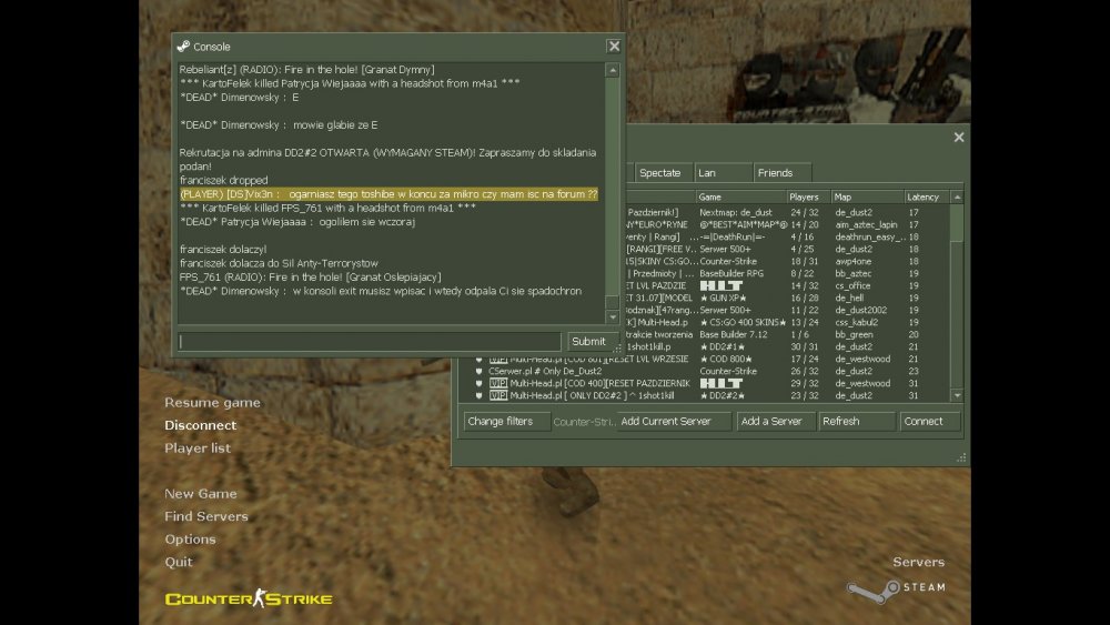 Data zdarzenia: Przed chwilaNick gracza: Rebeliant[z]Dowody: screeny niżej...Świadkowie: gracze serwera...Uzasadnienie: Ileż można pisać ze jakiś bachor może dziesięcioletni nawija ciągle przez mikrofon... I jeszcze to " nie mów mi co mam robić" Screen z tabelą żeby pokazać ze ten admin jest na serwerze... @Rebel napisałem w sumie 3-4 razy, ale tamtych screenów nie mam ponieważ byłeś na spect i mogło Cię nie być akurat. Danke ma wgląd do logów więc jeżeli jest taka potrzeba może zajrzeć. Po drugie Twoje uwagi do mnie nie trafiają z racji iż piszesz formy grzecznościowe z małej litery i Ty mi będziesz mówił o szacunku... śmiech