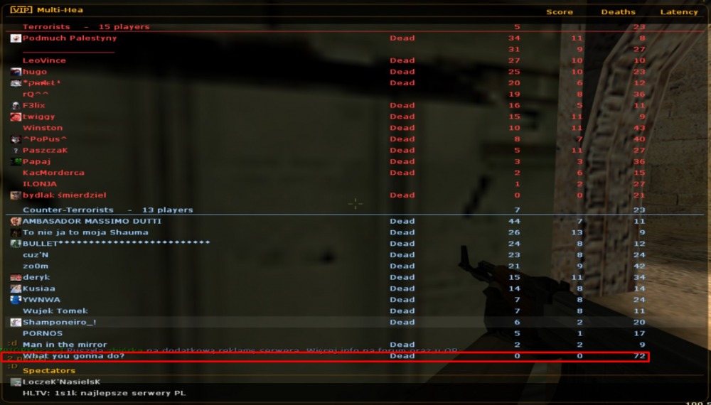 Otóż od dłuższego już czasu na serwerze jest problem z jakimś gówniakiem/gówniakami, co to nieustannie podszywają się pod ludzi zawsze z topki serwera. Następnie jedynie co robią, to trolują, psują top15, blokują bramy, ludzi czy też tylko udają że pilnują bs'a wpuszczając wszystkich jak leci jednym słowem zamęt. O ile w przypadku graczy ze steamem idzie jeszcze łatwo rozpoznać, tak ns'y typu leovince już ciężej wyłapać. Dlatego proponuje, by wprowadzić system kont taki jaki jest na modach go mod. Czyste same konto bez udziwnień, po prostu przy wejściu prosi o hasło wpisujesz i grasz. Ewentualnie umożliwić dla chętnych osób dodanie flagi, która wymusza hasło przy wchodzeniu na serwer (tak jak mają vipy na nsie).