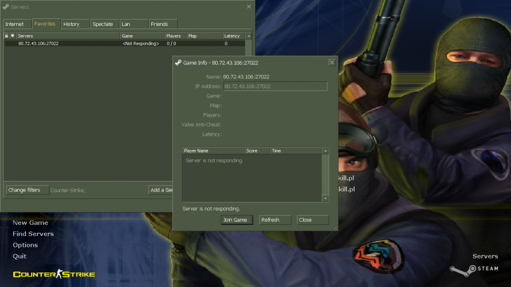 Siema, gram na codmod400. Ostatnio pojawił się problem. Mianowicie kiedy zmienia się mapa, wyrzuca mnie z serwera z powodu: fake client. connection was in idle state. Później przez jakieś 35-40 nie mogę wejść na serwer, pokazuje, że nikt na nim nie gra a sam serwer jestem wyłączony. Nie pomaga odświeżanie, wyłączenie i ponowne włączenie gry, a także reinstall fry. Ktoś pomoże>