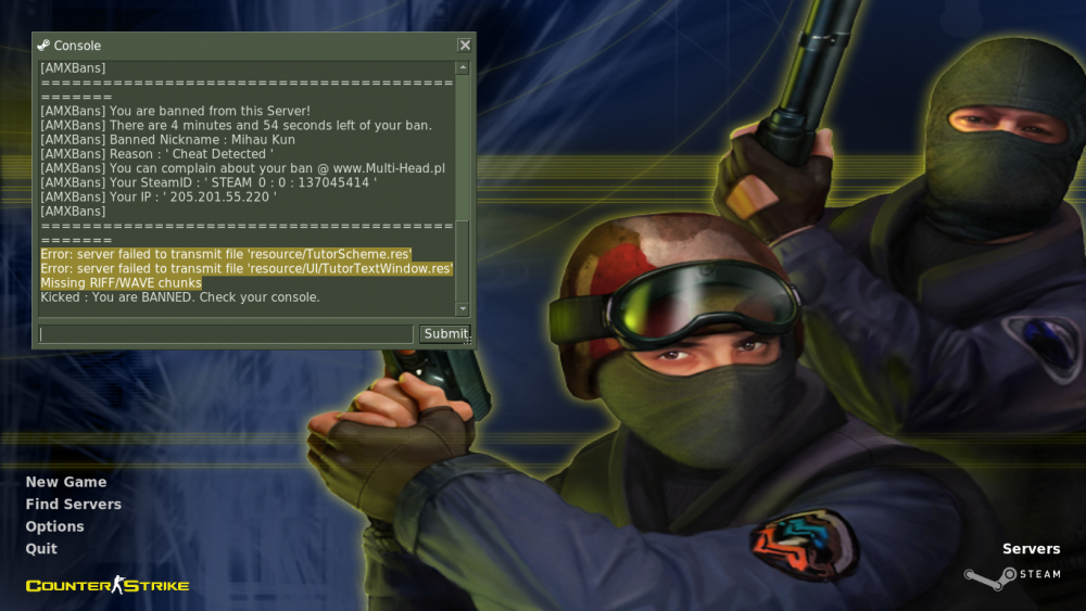 Tak jak na załączniku po niżej, mogę wejść na serwer lecz dostaje bana za cheaty, ( Cod Mod 400 lvl ), gram na Linuxie przez steam. potrzebuję pomocy w "Missing RIFF/WAVE chunks" gdyż nie wiem co to jest. Próbowałem rozwiązać problem na własną rękę lecz bez skutecznie pozostałe dwa pliki "Error" wystarczy ze pobiorę i zamienię, ale nie Missing RIFF/WAVE chunks. problem pojawia się w na każdym serwerze MultiHead i tylko na tym, inne serwery działają bez problemu Error: server failed to transmit file 'resource/TutorScheme.res' Error: server failed to transmit file 'resource/UI/TutorTextWindow.res' Missing RIFF/WAVE chunks