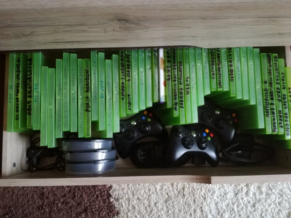 Sprzedam xboxa 360 z wieloma grami 3 padami i kinectem ładowarką do padów. kinectu na zdj nie ma ale mogę dorzucić za chwilkę. gry jak na zdj mn. Śródziemie: Cień Mordoru gta 5 fifa 18 pes 18 far cry 3 ,4 duzo gier na kinect: kręgle, just dance i wiele innych, jest w co pograc zapewniam cena 700zl