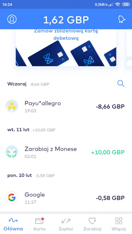 Siemka. Jak pewnie wiecie możliwość zarabiania w sieci istnieje od długiego czasu, ale można też zarabiać bez wkładu własnego, w co wiele osób nie chce uwierzyć. Monese jest jedną z niewielu aplikacji, która oferuje nam za darmo 50zł. Jak to działa? Krok po kroku opiszę Wam poniżej. 1. Ściągamy aplikację Monese, ze sklepu play, app store czy strony Monese.com 2. Podczas rejestracji ważnym jest aby użyć kodu zaproszeniowego "MATE9761" (bez niego nie otrzymasz bonusu) 3. Następnie wybieramy konto UK (dlaczego? dlatego, że funt stoi najdrożej) oraz darmowy plan SIMPLE 4. Wypełniamy wymagane pola, weryfikujemy się 5. Po zalogowaniu na konto w lewym górnym rogu widnieje "ludzik". Klikamy w niego, następnie w zakładkę "PROMOCJE" i wpisujemy "PREMIUMPLEASE" 6. Zamów wirtualną kartę, fizycznej jeżeli nie potrzebujesz nie zamawiaj. 7.. Po założeniu konta skontaktuj się ze mną za pomocą forum/steam (https://steamcommunity.com/id/junioreg). Po co? Przeleje Ci funta na te konto, a ty musisz dokonać dowolnej płatności (sklep play, app store, aliexpress itp) na dowolną kwotę. Bonus zostanie przyznany w przeciągu 48h Chcesz dalej zarabiać? Polecaj innym i zarabiaj! 50zł za każdą osobę, która zarejestruje się za pomocą Twojego kodu. Załączam zdjęcie potwierdzające przyznanie bonusu na moje konto.